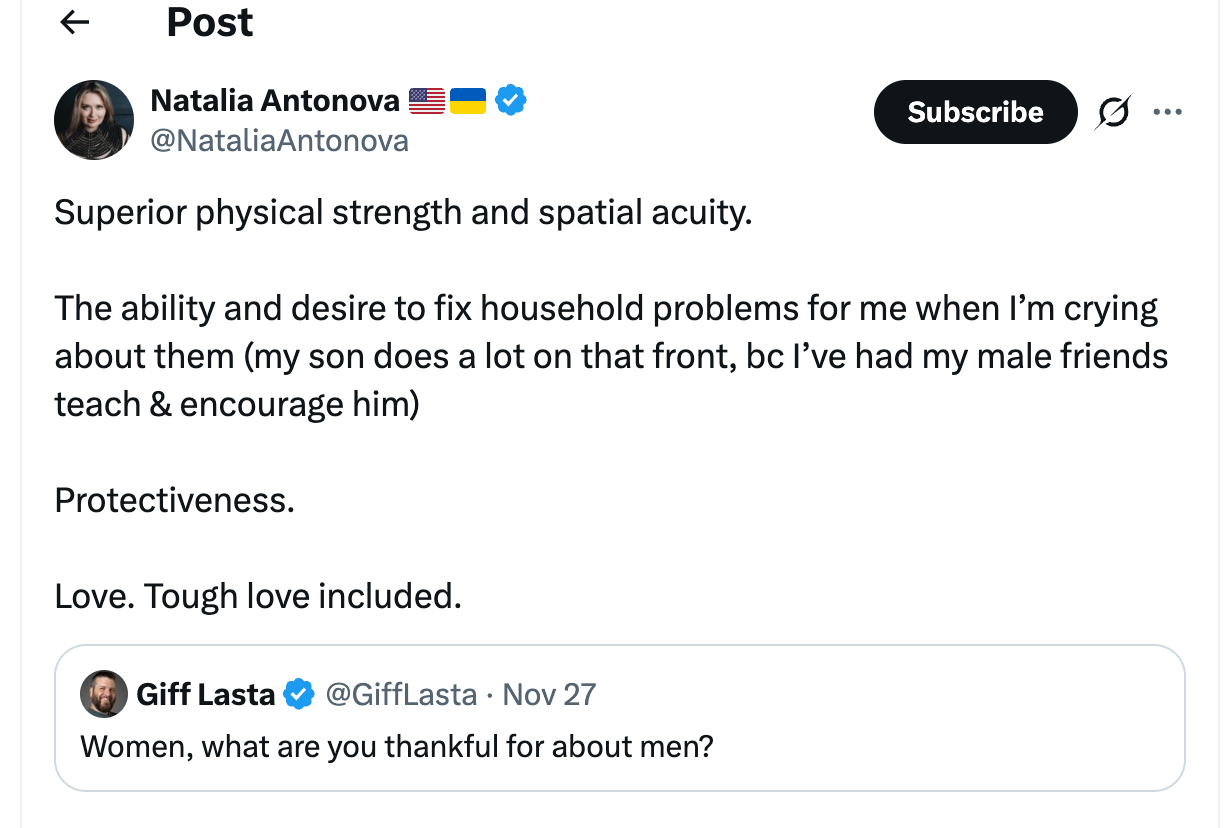 Amy wrote to tell me that she was canceling her subscription, and cited the tweet above. She told me I was “spreading harmful stereotypes” about male physical strength and spatial acuity.